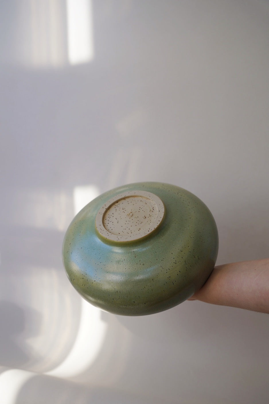 An der Drehscheibe gefertigte Schale aus gesprenkeltem Steinzeugton. Seidenmatte, grüne Glasur auf der Innen- & Außenseite.
